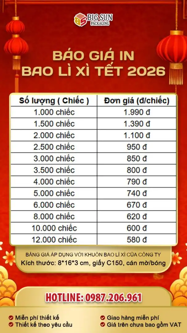 Để nhận báo giá in lì xì tết chính xác nhất, quý khách vui lòng liên hệ trực tiếp hotline của Big Sun.