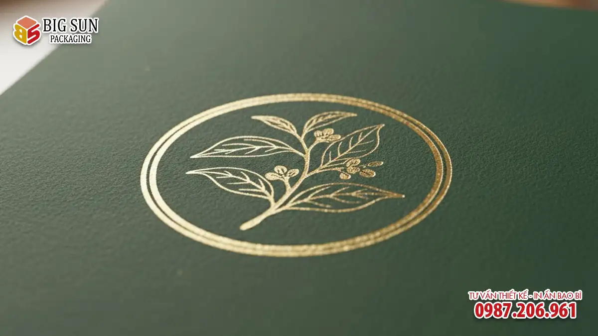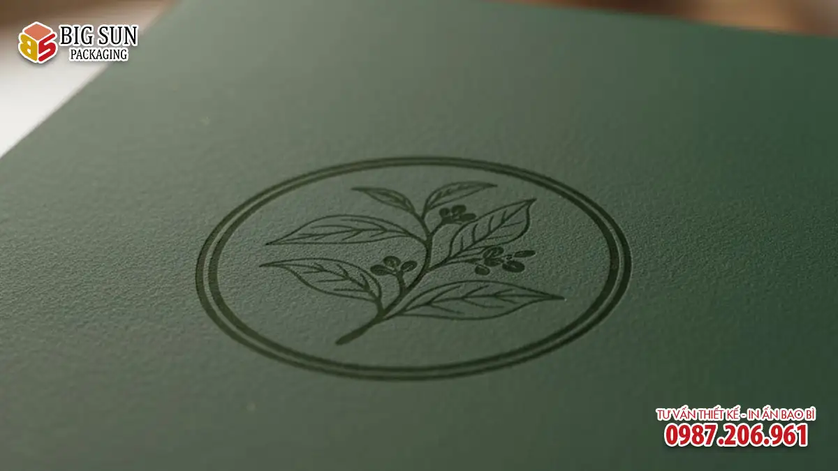 - Lời khuyên từ Big Sun: Kỹ thuật này phát huy hiệu quả tốt nhất trên giấy dày (định lượng từ 300gsm trở lên) hoặc trên hộp cứng. Nó thường được kết hợp với ép kim (dập nổi logo rồi ép kim lên) để tạo hiệu ứng sang trọng bậc nhất.