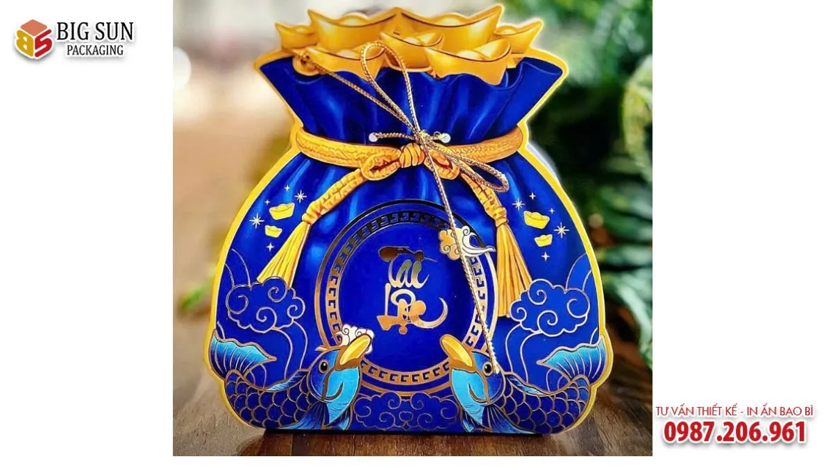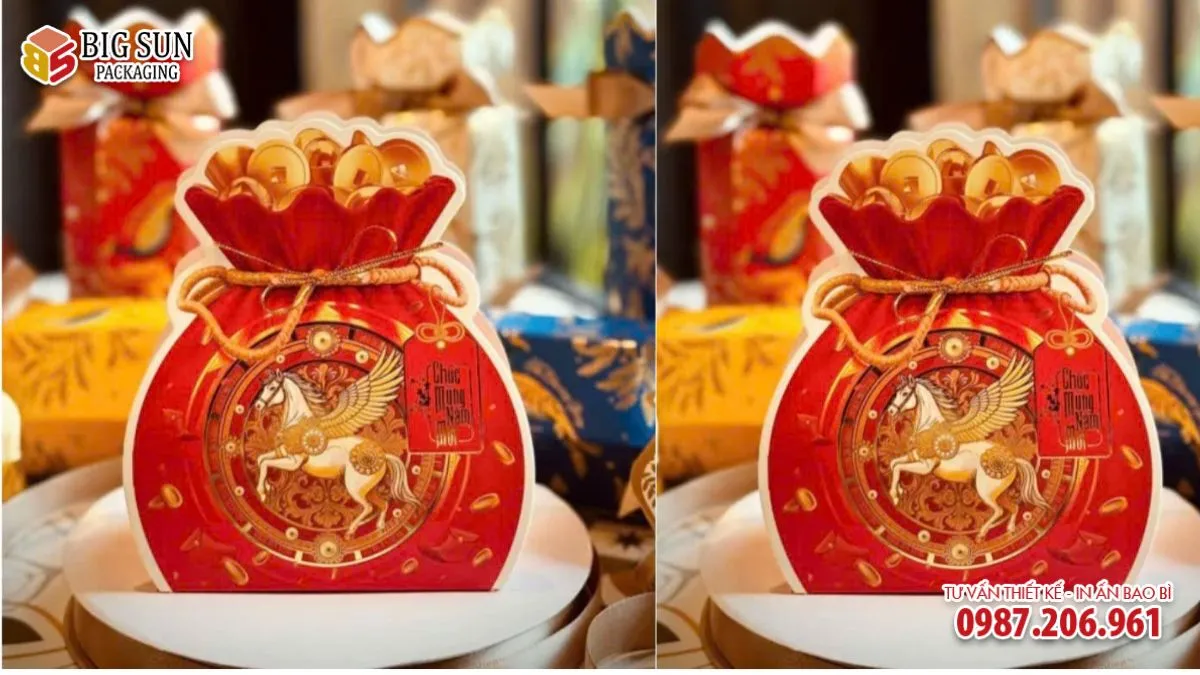 Đặc biệt, các mẫu hộp đựng bánh kẹo hình túi tiền ngày càng được ưa chuộng bởi hình dáng độc đáo, ý nghĩa phong thủy rõ ràng và khả năng tạo ấn tượng mạnh ngay từ ánh nhìn đầu tiên. Đây là dòng bao bì quà Tết vừa mang giá trị thẩm mỹ, vừa thể hiện lời chúc tài lộc, phú quý và may mắn cho năm mới.