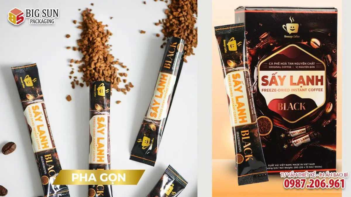 Khác với các dòng cà phê có sữa hoặc hương liệu, cà phê sấy lạnh Black không cần những hình ảnh cầu kỳ. Thiết kế hình ảnh trên hộp được xây dựng theo hướng tối giản, tập trung vào tên sản phẩm, thông tin cốt lõi và cảm giác về hương vị.