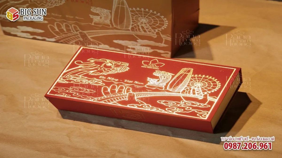 Sau in, hộp có thể được hoàn thiện bằng các kỹ thuật như cán mờ để tăng độ sang trọng và hạn chế bám vân tay; ép kim logo hoặc tên bộ quà để tạo điểm nhấn cao cấp; dập nổi nhẹ nhằm tăng chiều sâu thị giác.