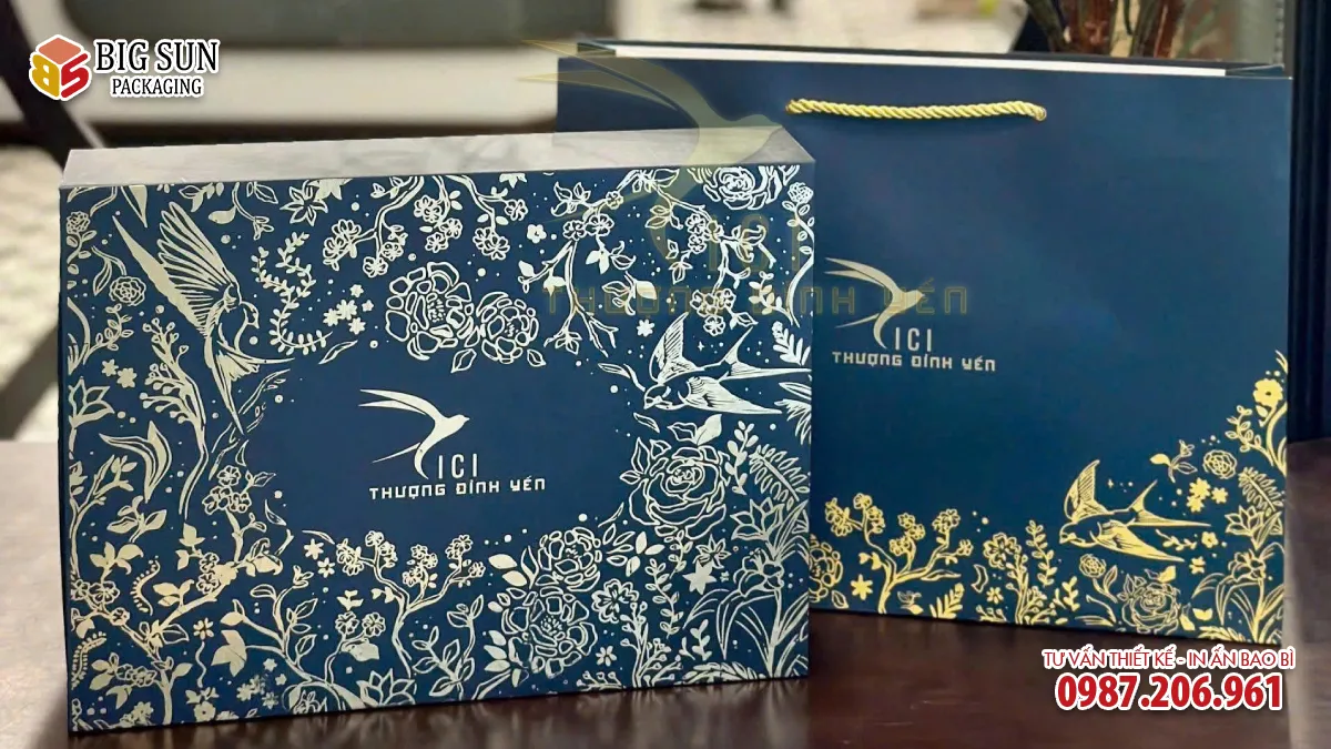 Big Sun cũng khéo léo điểm xuyết ánh vàng trên bề mặt hộp, tạo điểm nhấn thị giác mà không làm mất đi sự tinh tế chung. Sự kết hợp giữa xanh đậm và vàng mang lại cảm giác ấm áp, trang nhã, giúp hộp yến nổi bật khi trưng bày nhưng vẫn giữ được vẻ nhã nhặn cần có trong các dịp biếu tặng trang trọng. Chính cách xử lý màu sắc có chiều sâu này của Big Sun đã góp phần làm cho hộp đựng yến trở nên cuốn hút, thể hiện rõ sự đầu tư và trân trọng dành cho sản phẩm bên trong.