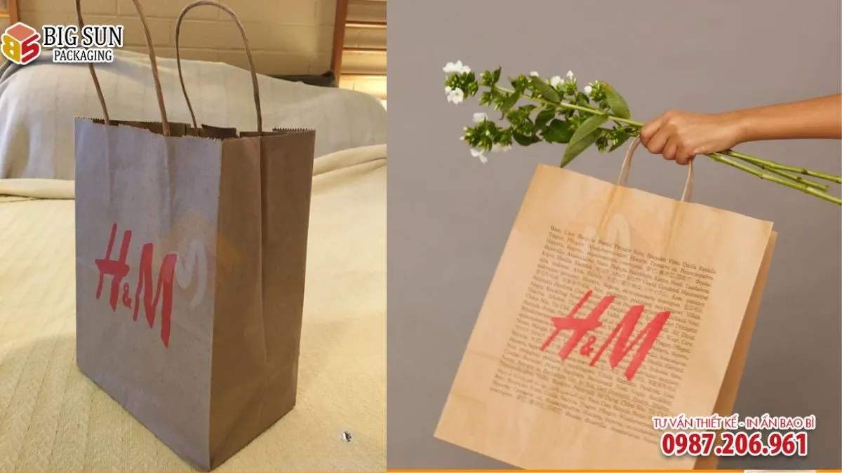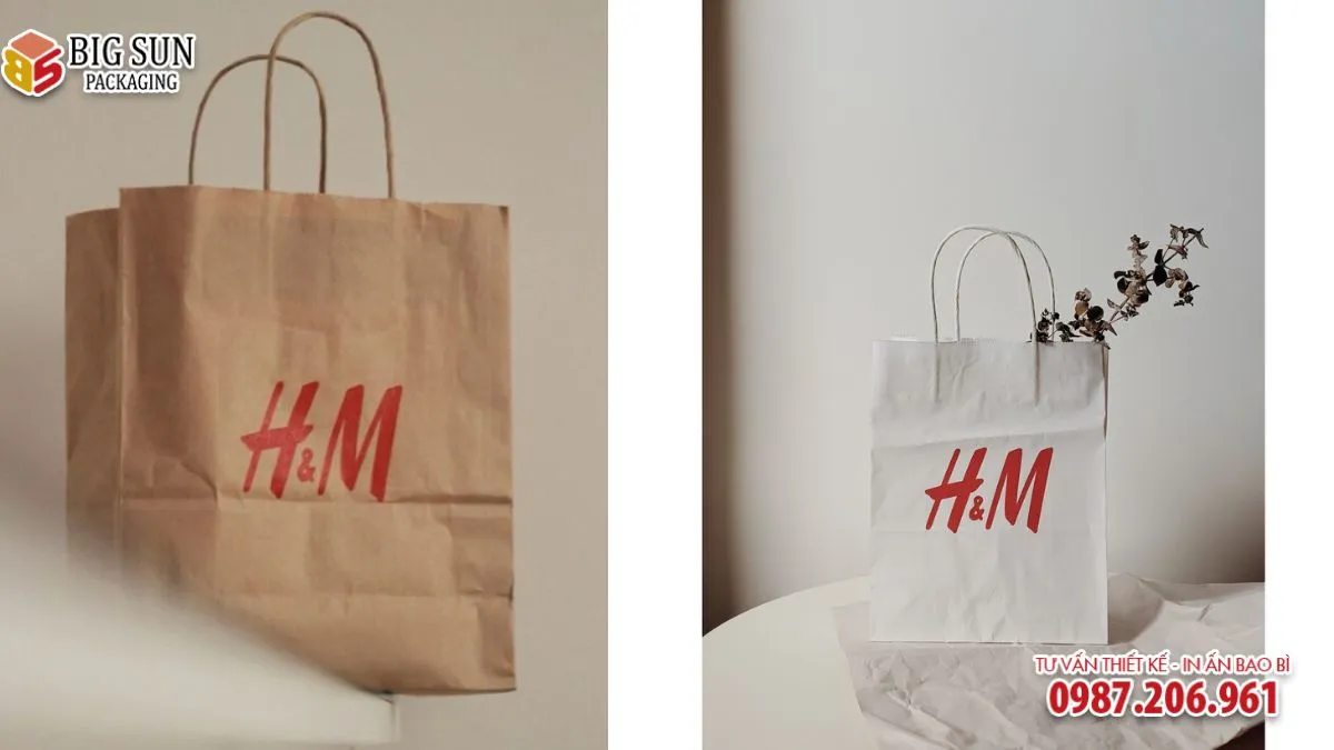 Logo có thể được ứng dụng kỹ thuật in lụa hoặc phủ bóng nhẹ để tạo độ nổi khối, giúp chữ “H&M” bắt sáng nhẹ nhàng khi đặt dưới ánh đèn showroom. Sự tỉ mỉ trong từng nếp dán và khớp nối cho thấy sự chuyên nghiệp trong quy trình sản xuất bao bì dành riêng cho ngành thời trang.