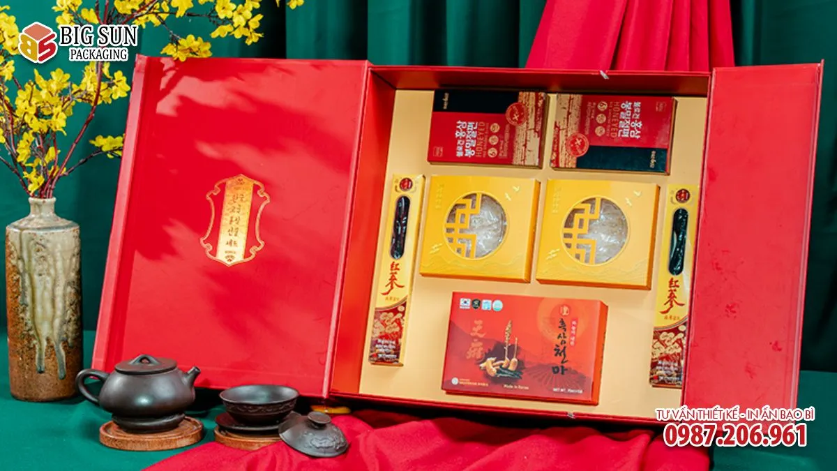 Big Sun tập trung vào giải pháp thiết kế – gia công hộp quà trọn gói, phù hợp với các dòng quà Tết cao cấp như yến sào, hồng sâm, thực phẩm dinh dưỡng, rượu vang hoặc quà biếu doanh nghiệp. Mỗi mẫu hộp được xây dựng dựa trên đặc trưng sản phẩm bên trong, tinh thần thương hiệu và mục tiêu sử dụng thực tế trong mùa Tết.