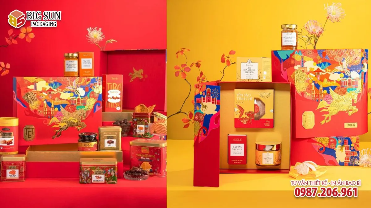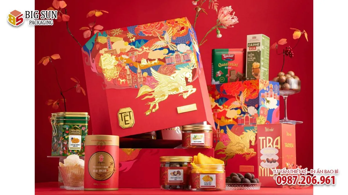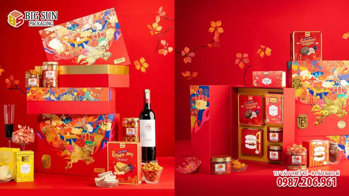 Quy trình in ấn và gia công được kiểm soát chặt chẽ giúp màu sắc hộp ổn định, form hộp cứng cáp, cấu trúc chắc chắn, phù hợp cho việc đóng gói sản phẩm thực phẩm cao cấp và triển khai số lượng lớn trong mùa Tết.