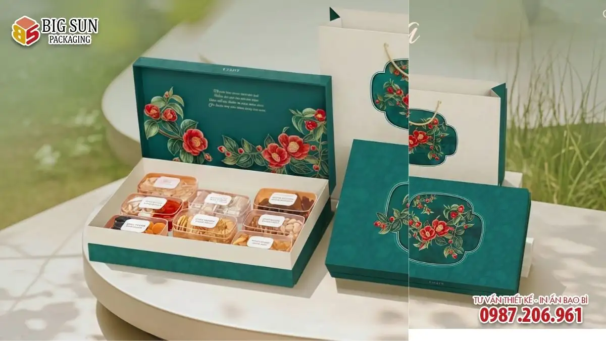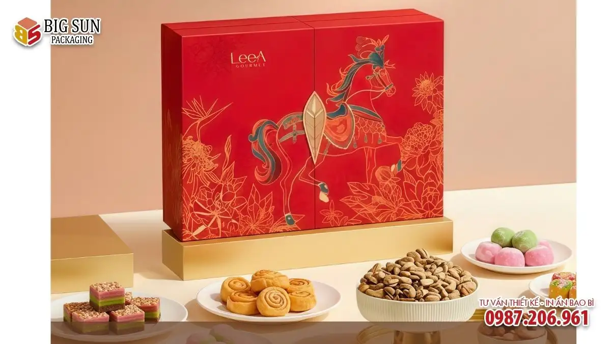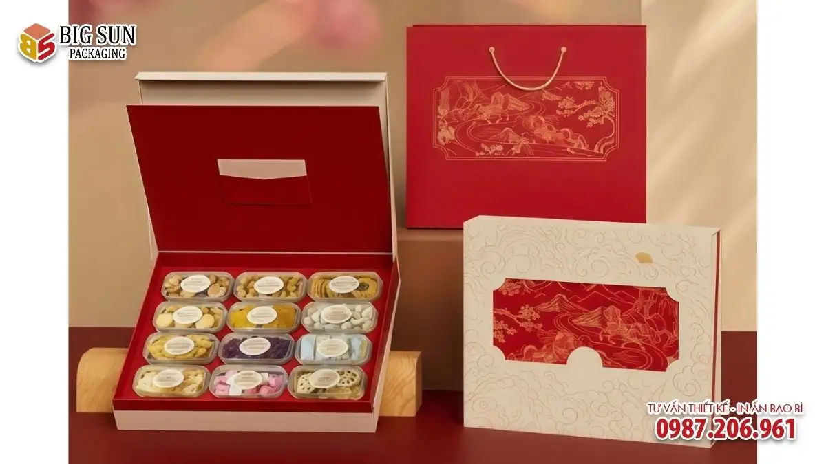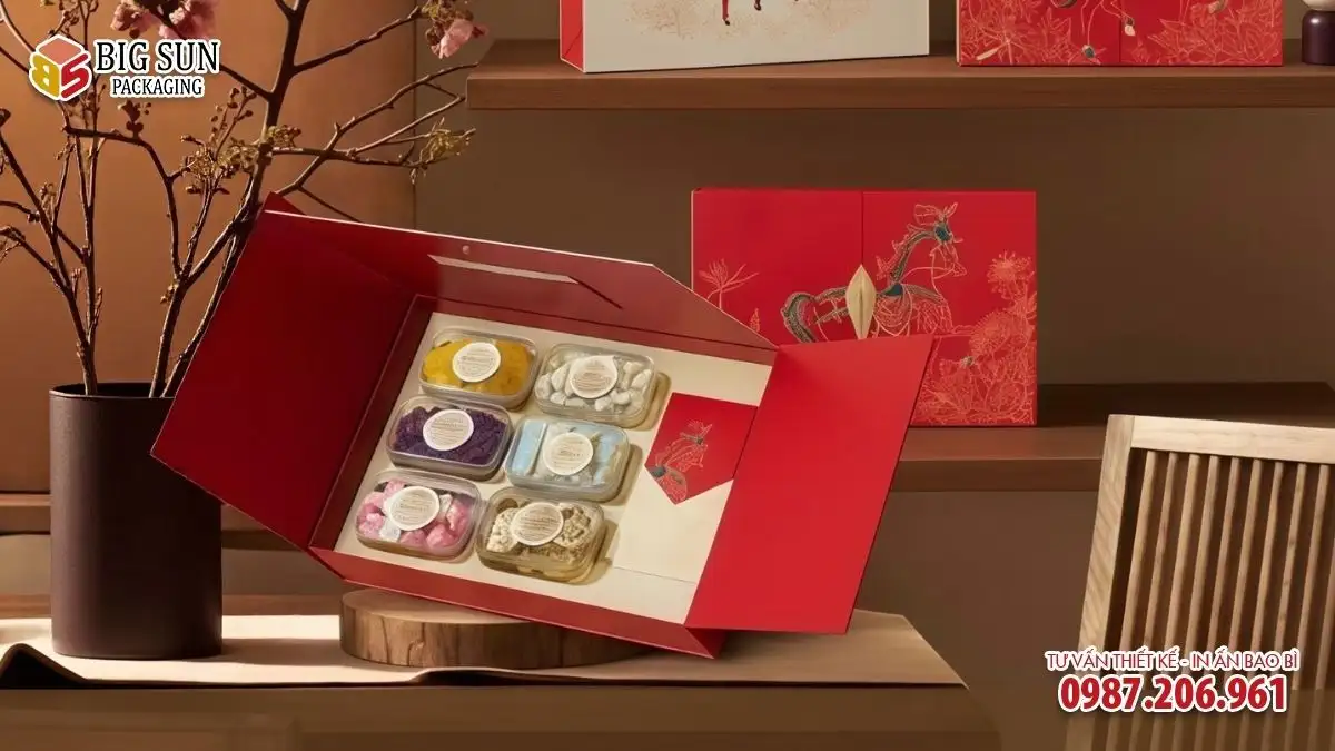 Nhờ quy trình sản xuất được kiểm soát chặt chẽ, hộp Tết thương hiệu do Bigsun thực hiện luôn giữ được form dáng chuẩn, màu in ổn định và độ hoàn thiện cao.