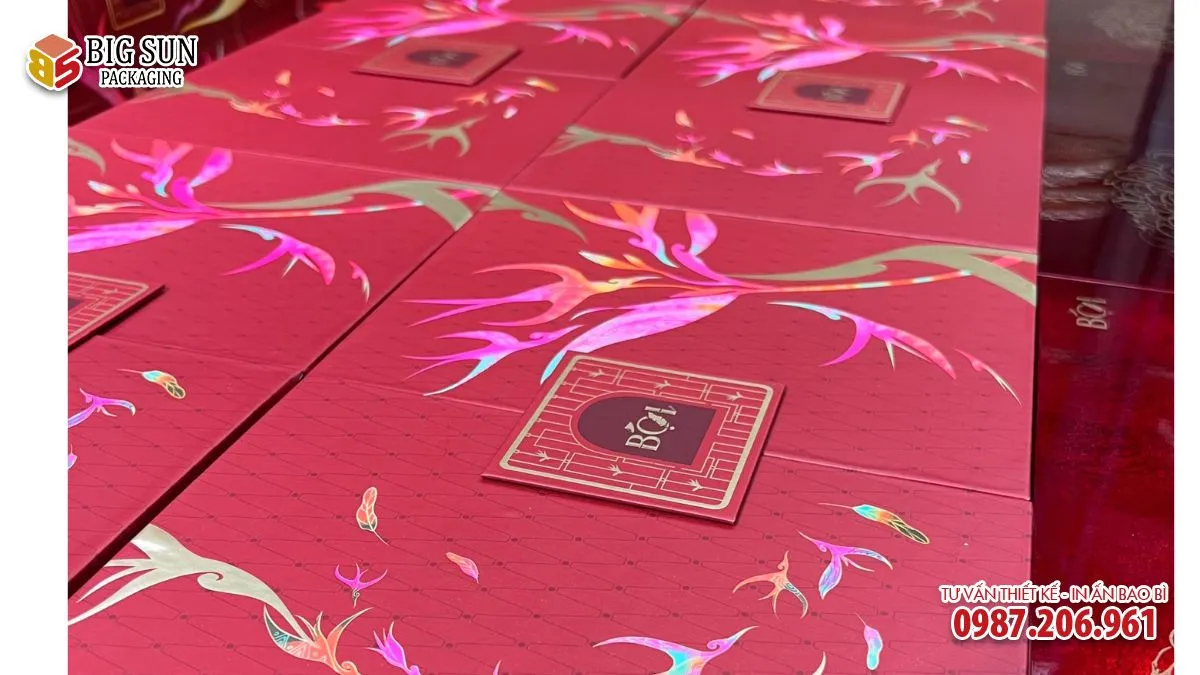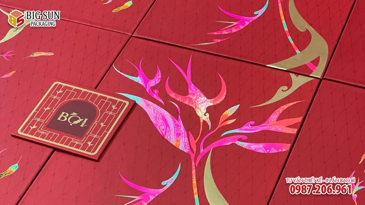 Các chi tiết hoa văn không đơn thuần là in phẳng, mà có sự nhấn nhá bằng ép kim và dập chìm nhẹ, giúp tổng thể hộp mang chiều sâu thị giác, gợi liên tưởng đến tranh sơn mài thủ công truyền thống. Đây là điểm cộng lớn, đặc biệt với các doanh nghiệp muốn gửi gắm giá trị văn hóa trong món quà Tết.