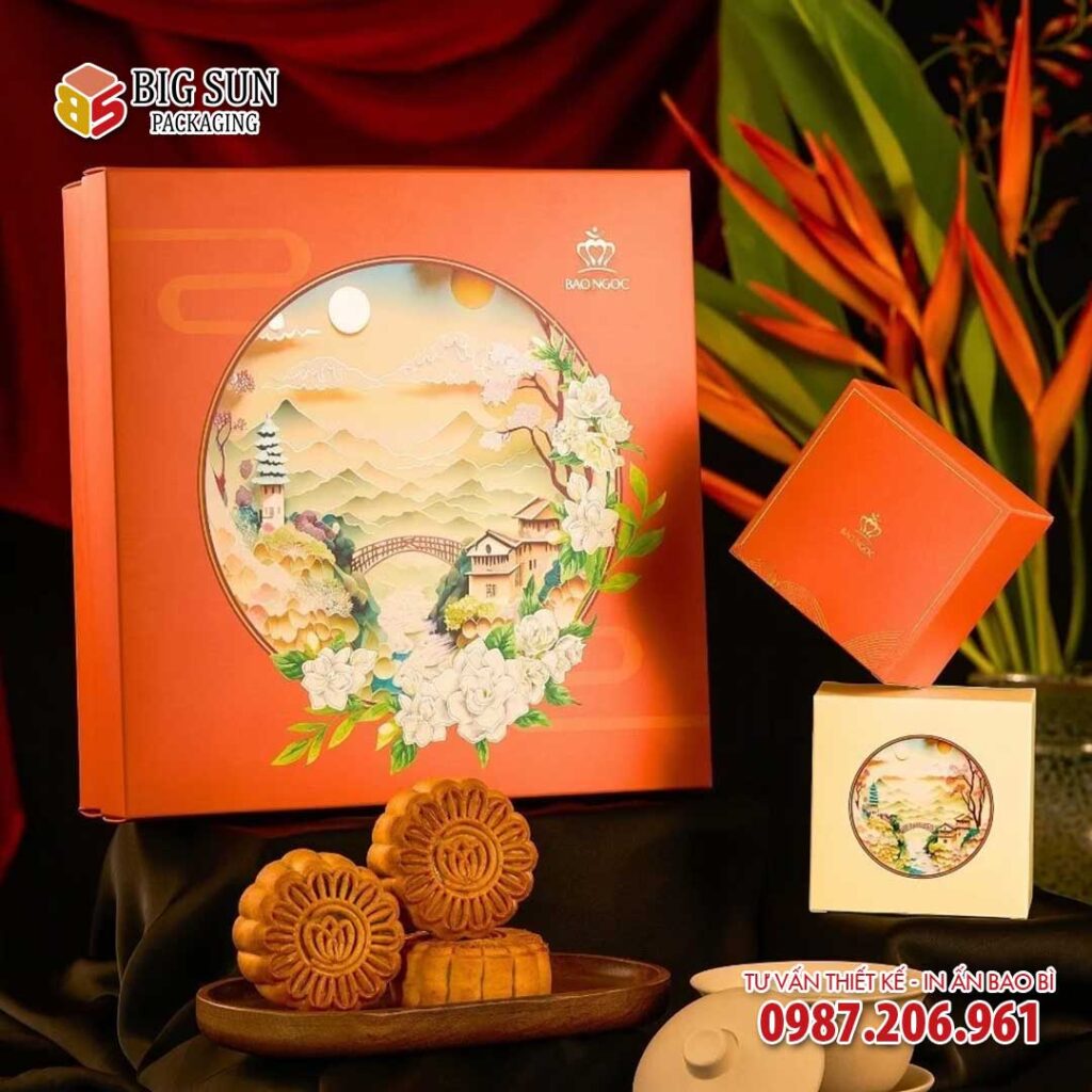 Mẫu in hộp bánh trung thu Bình An Bảo Ngọc màu cam là sản phẩm hợp tác độc đáo giữa Bigsun và Bánh Ngọt Bảo Ngọc, kết hợp hài hòa giữa thiết kế tinh tế và hương vị truyền thống, hứa hẹn sẽ là món quà ý nghĩa trong dịp Tết Đoàn Viên năm nay.