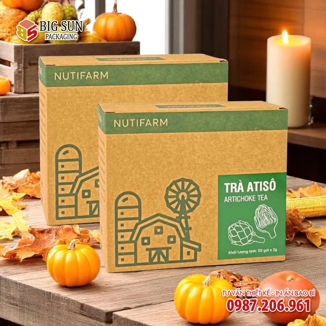 Giữa vô vàn những thiết kế cầu kỳ, bóng bẩy, mẫu in hộp trà atiso Nutifarm do Bigsun thực hiện lại chọn cho mình một lối đi riêng, một vẻ đẹp đến từ sự giản dị và chân thành. Nó không cố gắng gây ấn tượng bằng những chi tiết hào nhoáng, mà nhẹ nhàng chinh phục người nhìn bằng chính câu chuyện về một nông trại hữu cơ trong lành, nơi những búp atiso tinh túy nhất được vun trồng.