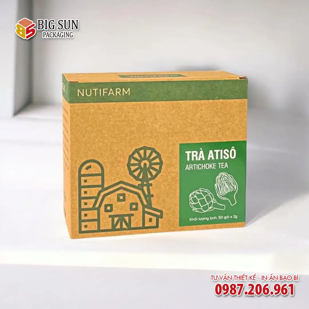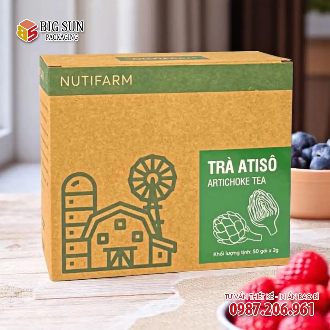 Bố cục được sắp xếp khoa học, cân đối, làm nổi bật tên thương hiệu “Nutifarm” và thông tin sản phẩm “Trà Atisô – Artichoke Tea”, giúp người tiêu dùng dễ dàng nắm bắt thông tin cần thiết. Đây chính là minh chứng cho một mẫu in hộp trà chất lượng cao khi mọi yếu tố đều được tính toán kỹ lưỡng.