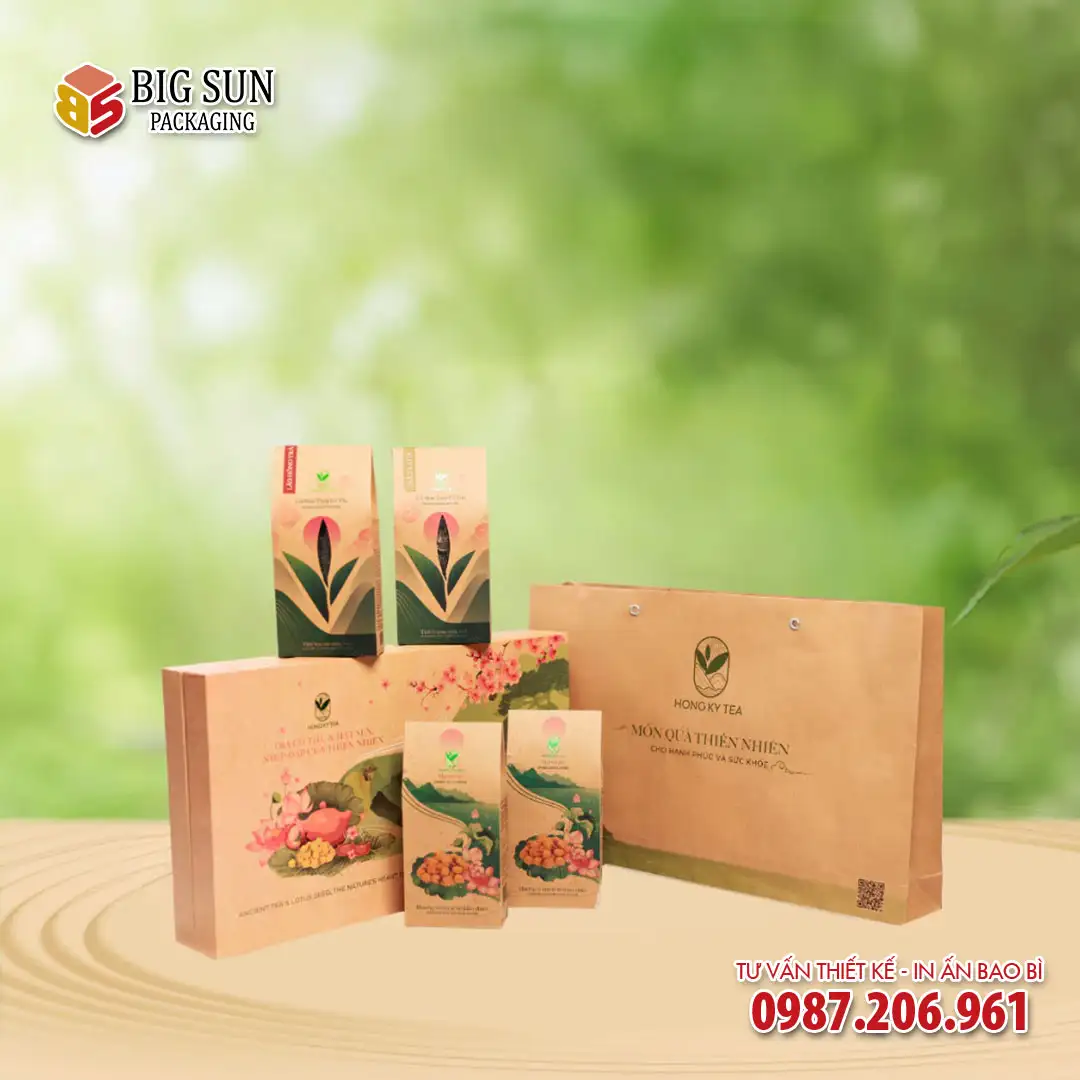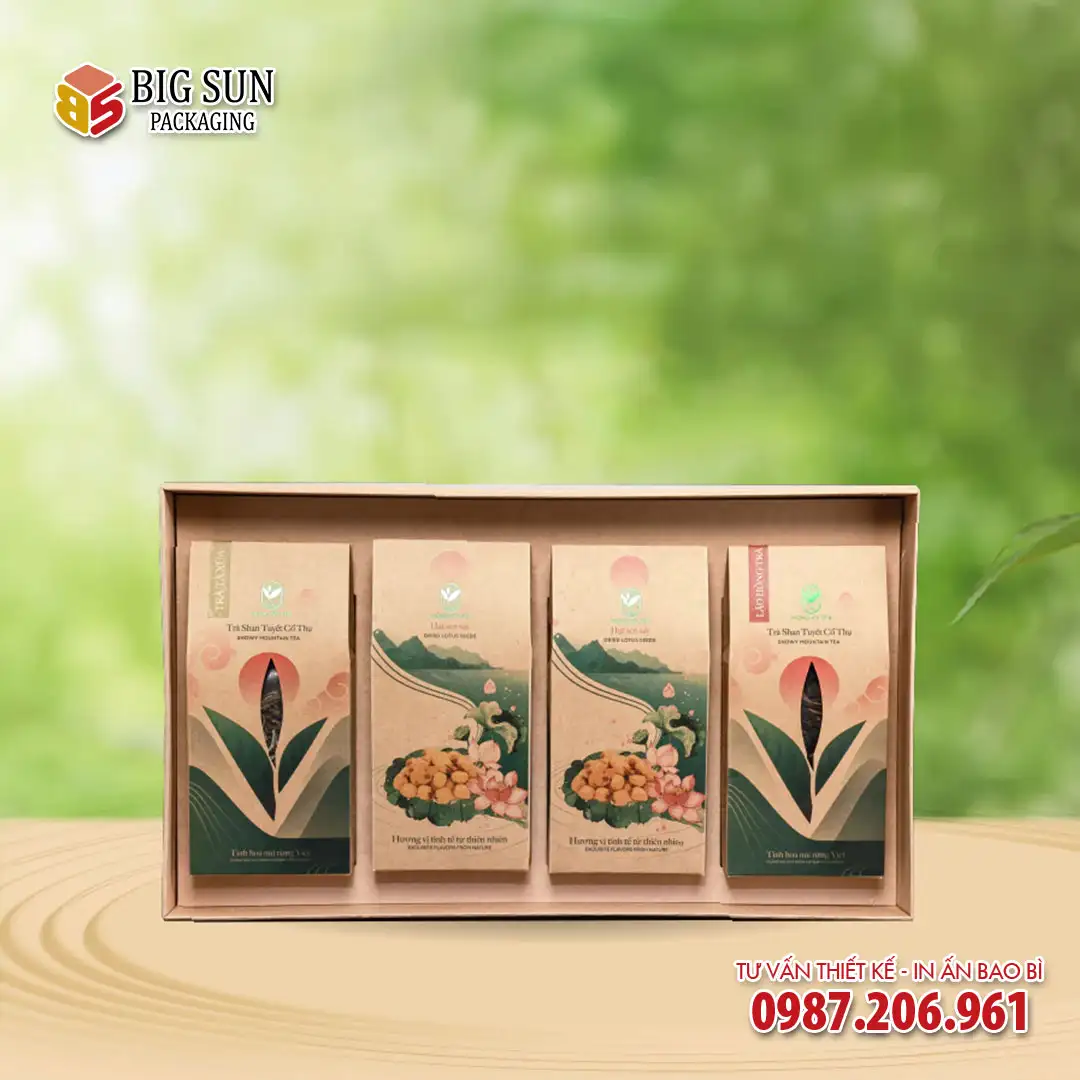 Đây là sự lựa chọn màu sắc thông minh, giúp cho mẫu in hộp trà quà tặng vừa tạo cảm giác sang trọng, vừa thân thiện và hợp xu hướng bao bì bền vững.