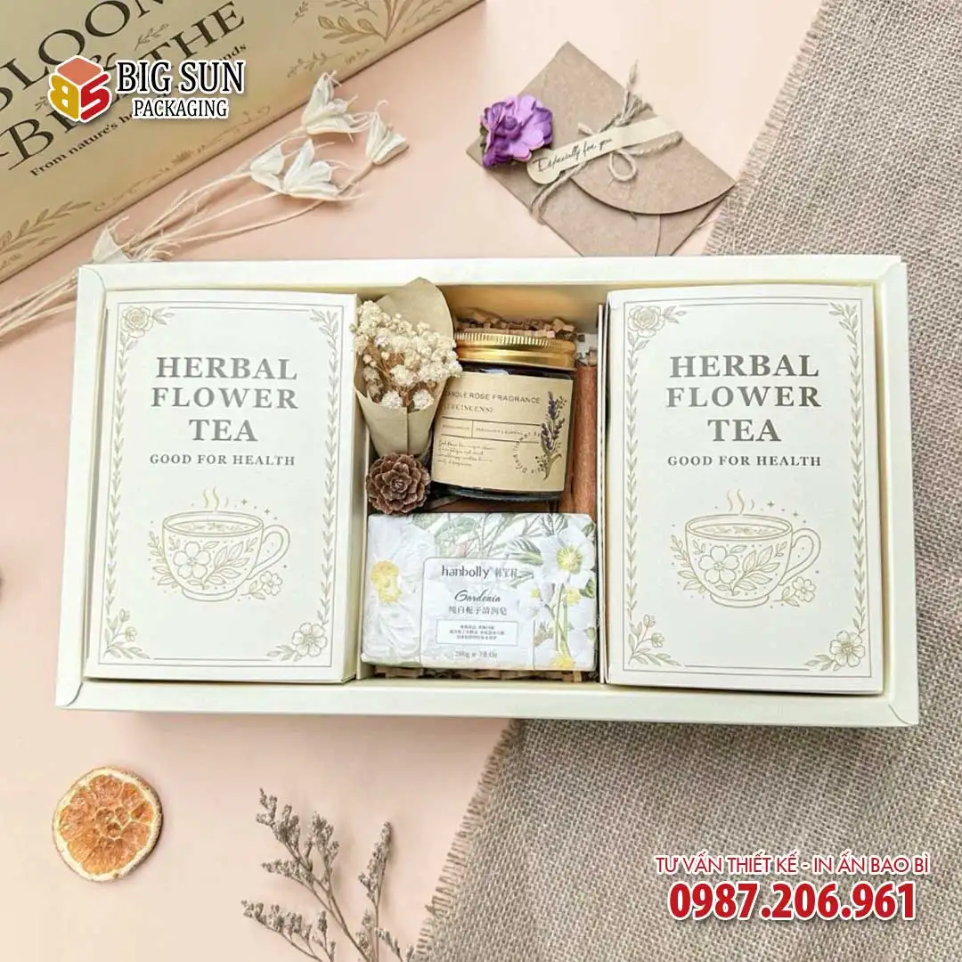 Chúng tôi lựa chọn tông màu kem làm chủ đạo, tạo cảm giác nhẹ nhàng, sạch sẽ và cao cấp, phù hợp với một mẫu in hộp trà làm quà tặng. Màu sắc này là một phông nền hoàn hảo để làm nổi bật các họa tiết hoa lá màu vàng nâu tinh tế. Sự kết hợp màu sắc này không chỉ mang lại hiệu ứng thị giác dễ chịu mà còn khơi gợi cảm giác ấm áp, gần gũi như chính hương vị của một tách trà thảo mộc. Đây chính là yếu tố tạo nên một hộp trà chất lượng cao, chinh phục được cả những khách hàng khó tính nhất.