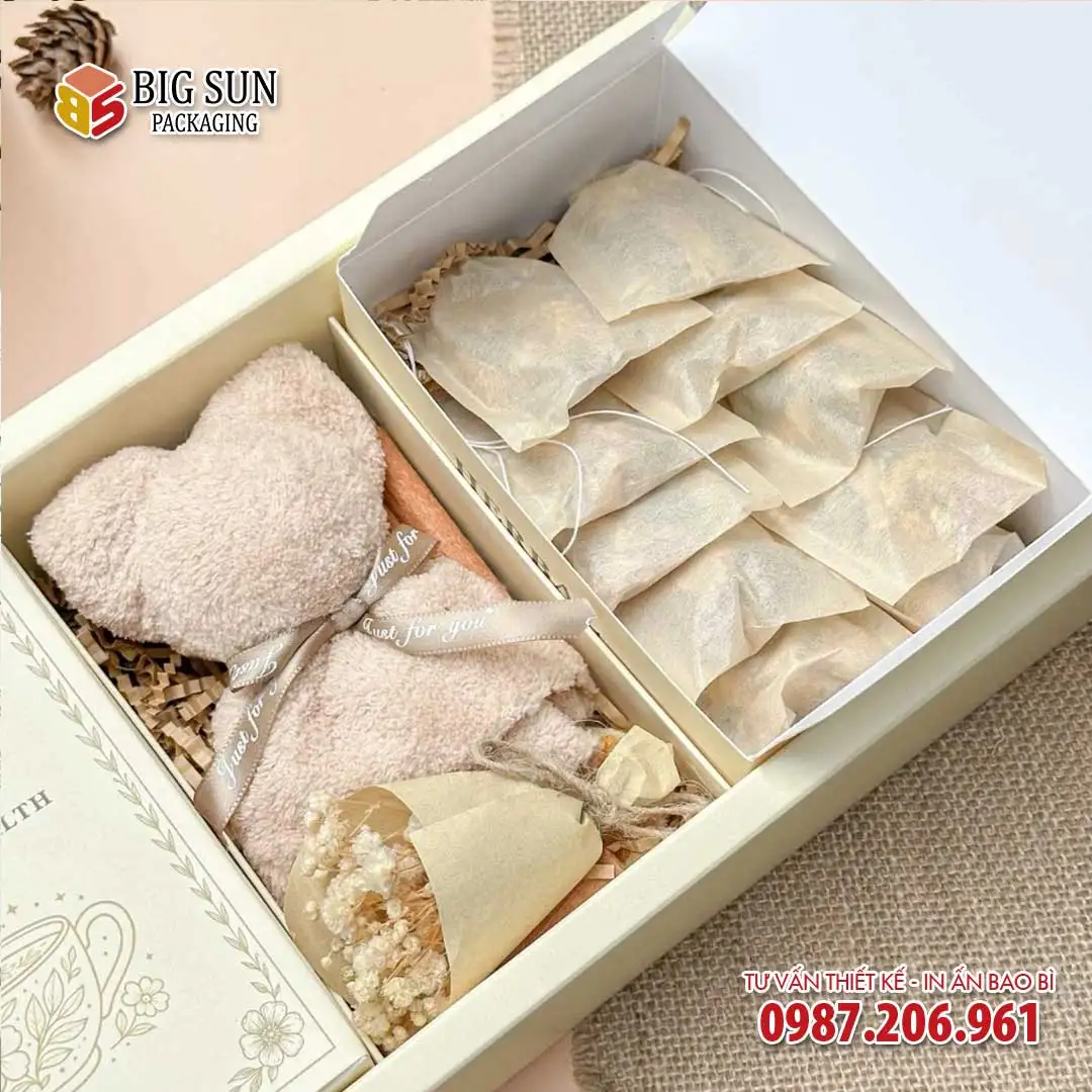 Bên trong, hộp được chia thành các ngăn riêng biệt một cách khoa học, giúp cố định sản phẩm (hộp trà, gấu bông, hoa khô…), tạo nên một bố cục quà tặng sang trọng và chỉn chu.