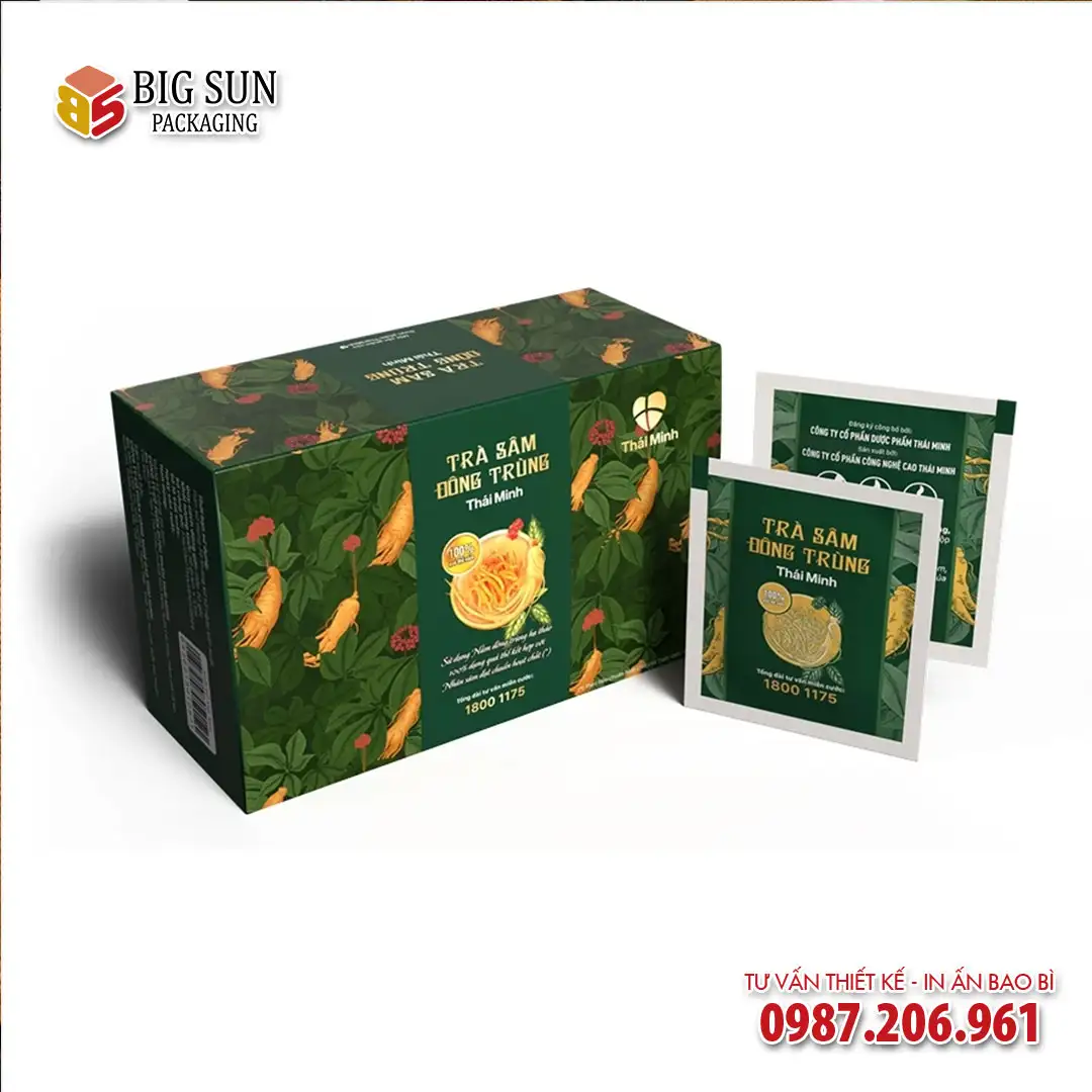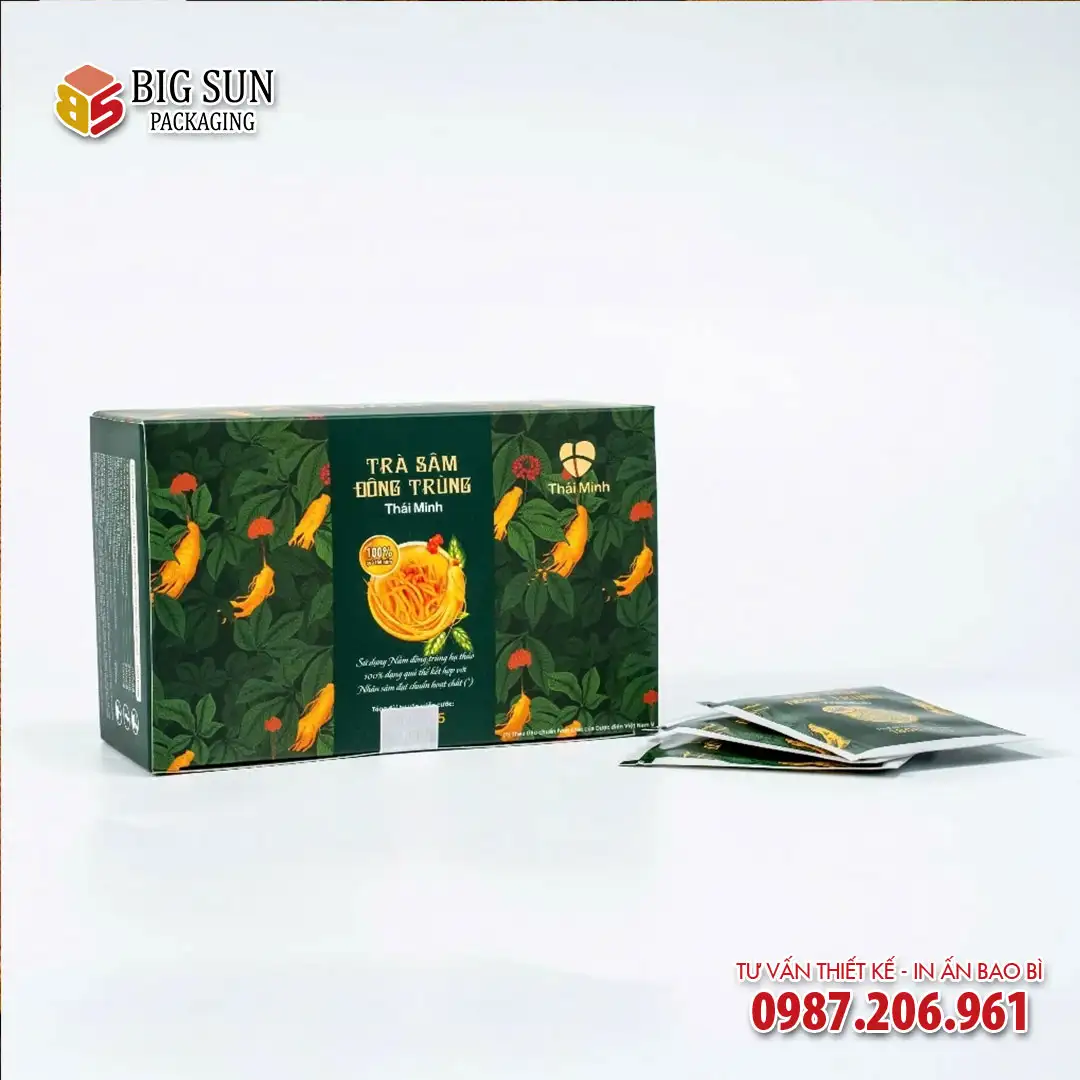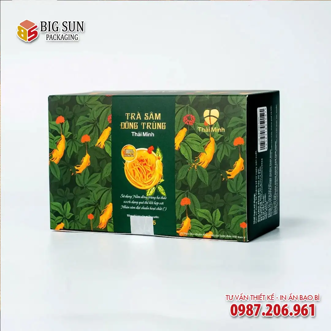 Tại Big Sun, chúng tôi không chỉ tạo ra bao bì, chúng tôi kiến tạo nên những đại sứ thương hiệu. Mẫu in hộp trà Sâm Đông Trùng Thái Minh do chính chúng tôi thiết kế và sản xuất là một tuyệt tác như vậy. Nó là minh chứng sống động cho việc một chiếc hộp được đầu tư kỹ lưỡng có thể biến một sản phẩm chất lượng trở thành một thương hiệu đẳng cấp, sang trọng và đầy tin cậy.