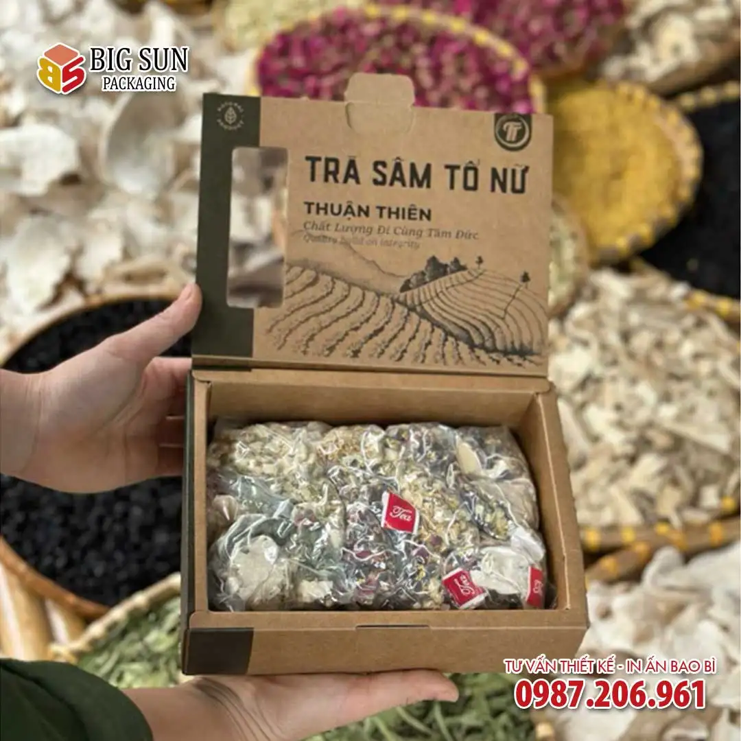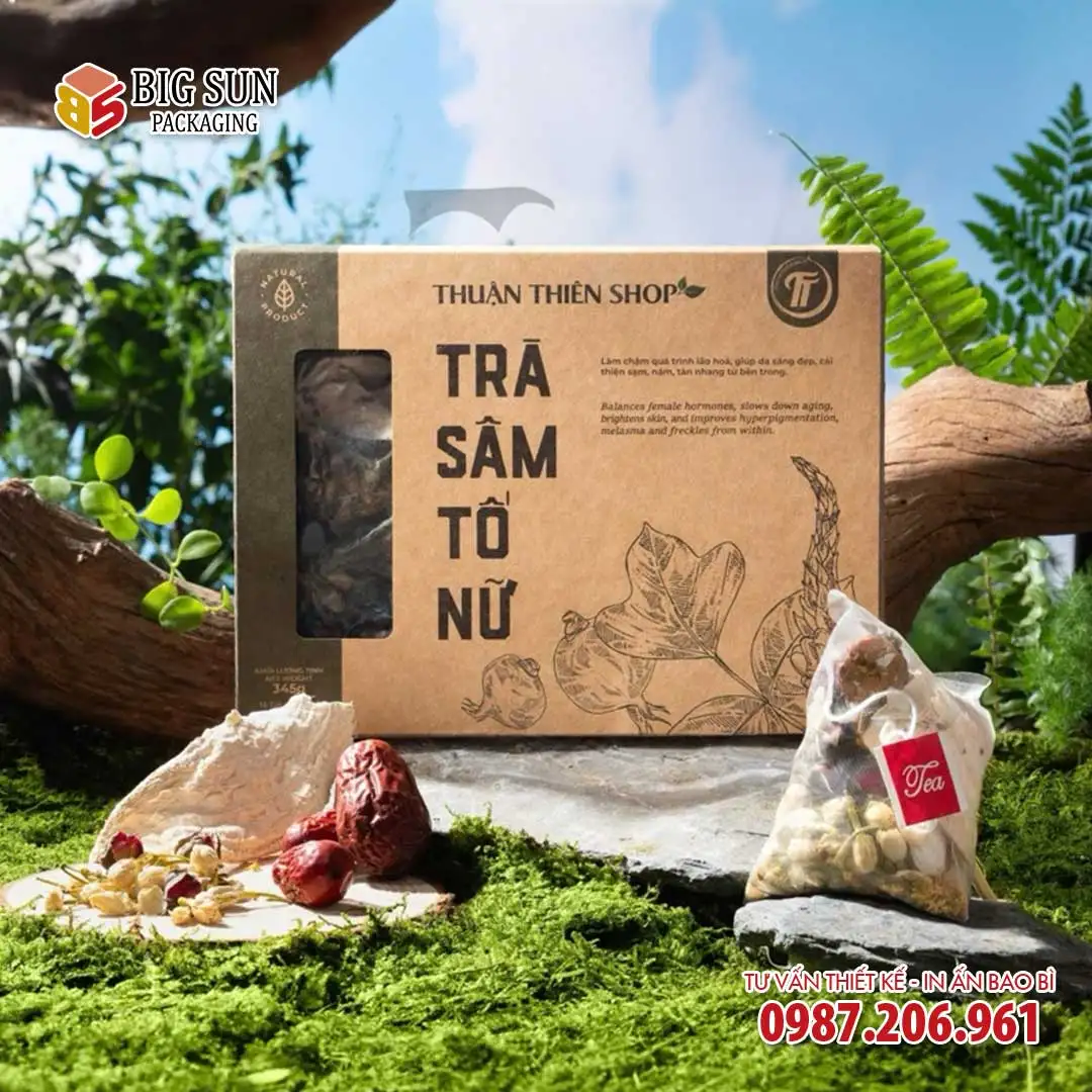 Mẫu in hộp trà sâm tố nữ Thuận Thiên Shop – một sản phẩm do chính chúng tôi tư vấn, thiết kế và sản xuất. Đây không chỉ là một chiếc hộp, mà là một tác phẩm gói trọn vẻ đẹp chân phương, biến sự giản dị thành một tuyên ngôn đầy sức mạnh về chất lượng và sự tận tâm, giúp thương hiệu kết nối sâu sắc với khách hàng của mình.