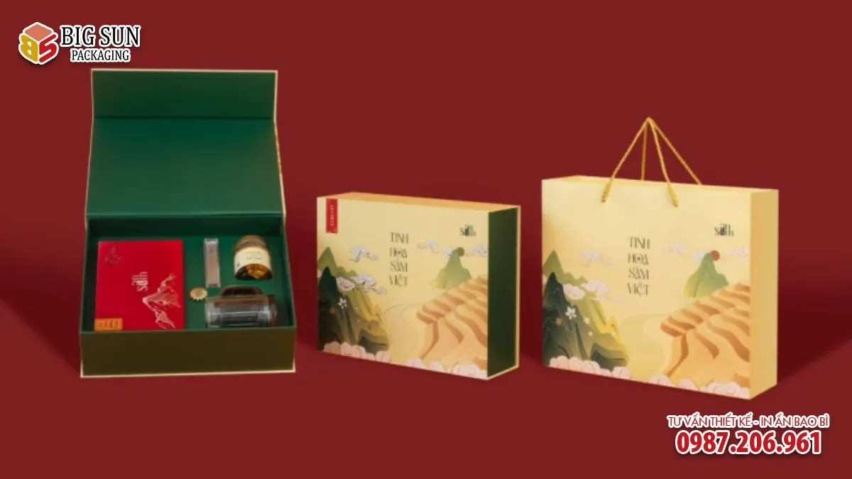 Bề mặt hộp được bồi giấy couche hoặc giấy mỹ thuật, giúp hình ảnh in sắc nét, màu lên đều và có chiều sâu. Khi chạm tay vào hộp, người dùng dễ dàng cảm nhận được độ chắc chắn, mịn màng – một cảm giác rất quan trọng với các sản phẩm quà tặng liên quan đến sức khỏe và tinh thần.