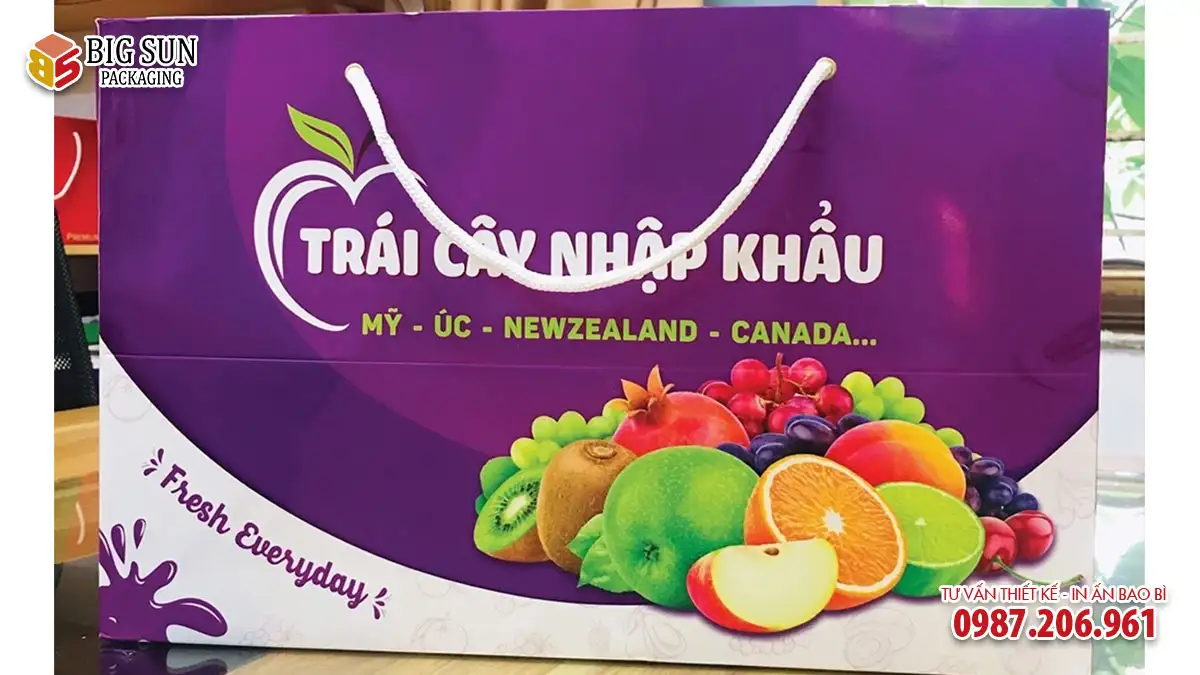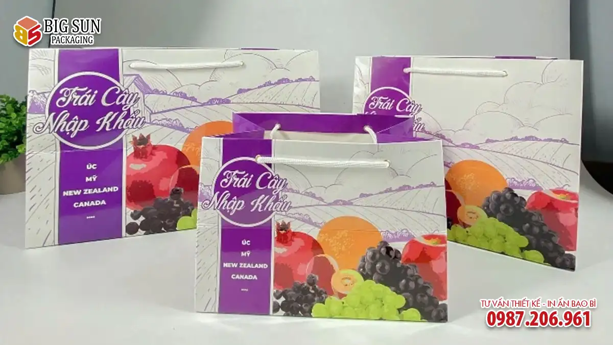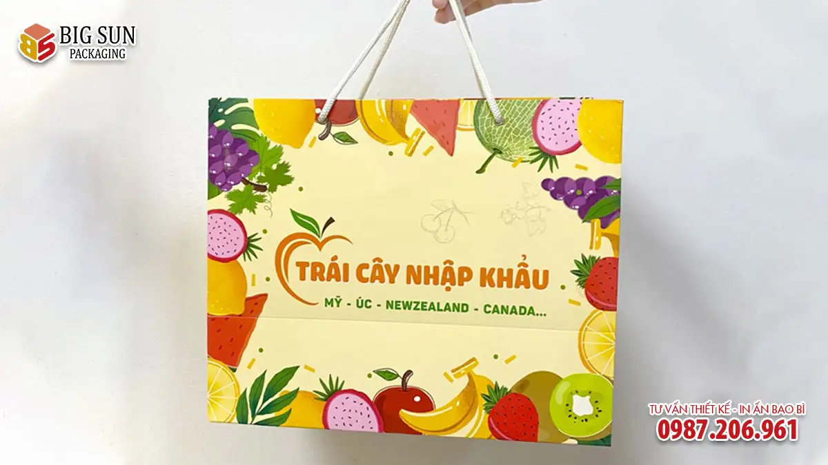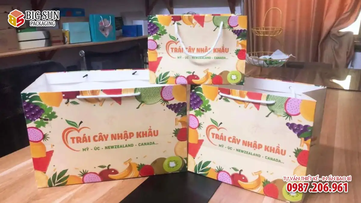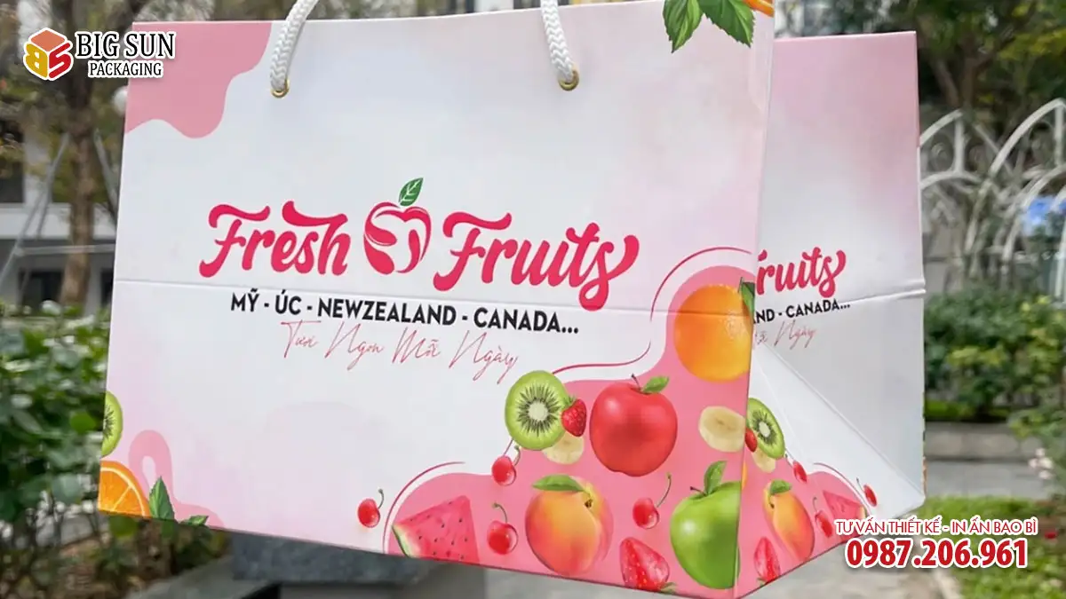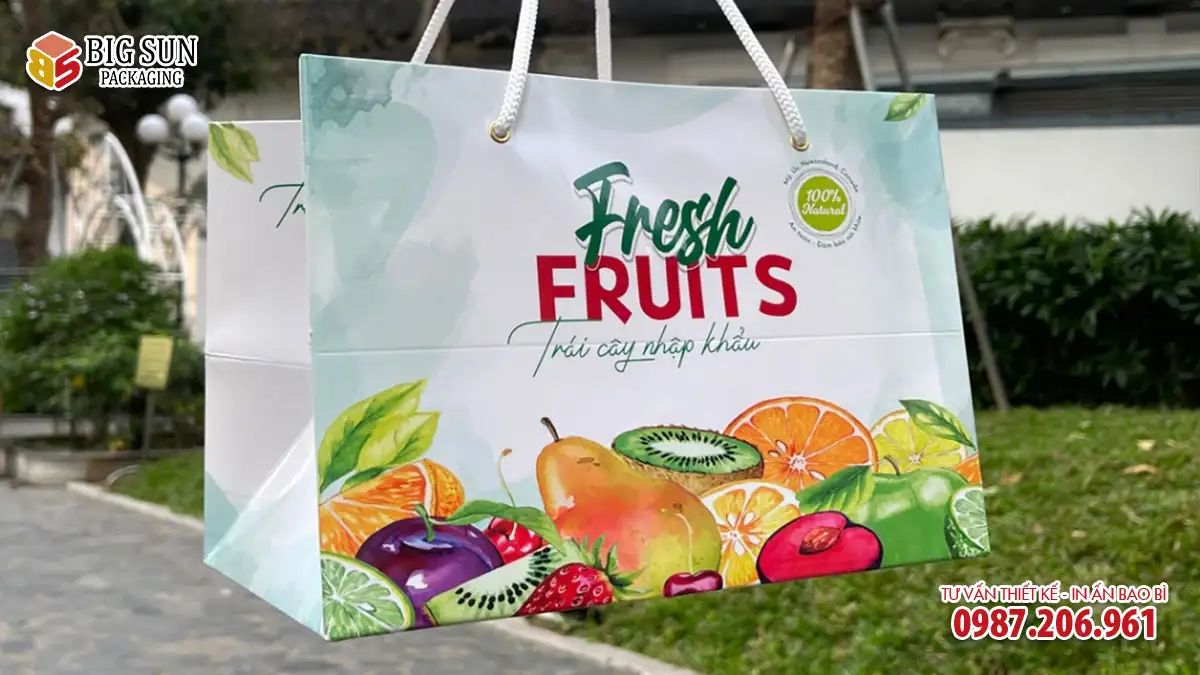 Lưu ý quan trọng: Sản phẩm là dòng túi giấy shopping cao cấp in họa tiết chung (không in tên shop cụ thể), chuyên dụng để xách, biếu tặng với khả năng chịu lực vượt trội. Nếu quý khách muốn in thương hiệu riêng, vui lòng tham khảo dịch vụ In túi hoa quả theo yêu cầu của chúng tôi.